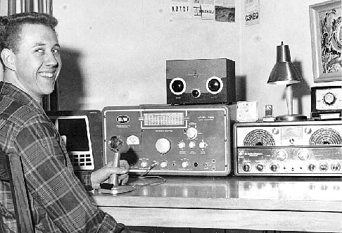 ![]() Photo courtesy K9MWM Bob Ludtke, KN9MWM operated his station in South Milwaukee, WI, where this photo was taken on October 24, 1958. On the table, from left to right, are: Hallicrafters speaker; Barker & Williamson 5100 transmitter -- 180 watts input CW, 145 watts AM phone (the later 5100-B offered a matching SSB exciter); and Hallicrafters SX-100 receiver. An EF Johnson Matchbox sits on the transmitter, and atop the receiver is a CDR rotator, which controlled Bob's 10 and 15meter, 2el cubical quad, up 40 feet. His microphone is a Turner model.