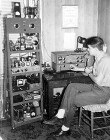 ![]() Photo courtesy WØRN Harry Snyder, WØNVE/WØRN in his late-1940s shack. On the table is a National NC-2-40D receiver, with speaker. His homebrew transmitter is 6V6 - 6N7 doubler - 6N7 doubler - 807 final, with power supply on the same chassis. Speech amplifier, built in 1947, is 6SJ7 - 6SN7 - 807s. VFO is a modified BC-458. He has one 304TL in the final amplifier, modulated with two 304THs (using half of each). Power supply, built in 1948, is two 3kw pole pigs in a full-wave rectifier circuit putting out better than one kilowatt. "When TV came in, this went out," says Harry. |