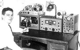 ![]() Photo courtesy WØRN Harry Snyder, WØNVE/WØRN's 1947 shack. Homebrew exciter is 6V6 - 6N7 doubler - 6N7 doubler - 807 final, modulated by 6SJ7 - 6SN7 - 807s. Receiver is a Hammarlund HQ-129X. The BC-453 on top of the receiver is set up as a sharp 50kc IF strip. To the right is a Dumont oscilloscope. |