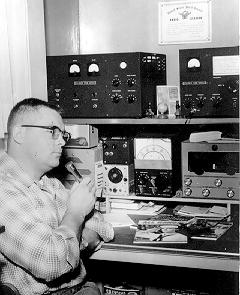 ![]() Photo courtesy WØRN Harry Snyder, WØNVE/WØRN also used "real up-town" commercial gear -- such as this Eldico SSB-100 with SSB-1000 amplifier. The SSB-100 ended with a 5894, while the amp had 4CX250Bs, and was hard to tune correctly. Below, center, is a Drake 1A receiver, along with a Knight-Kit general coverage receiver. Harry is still using his BC-453 50kc IF strip, and has a Heathkit SWR bridge. While on AM, his antenna was a 140-foot Inverted L, but when he moved to SSB he used a coax-fed doublet, 80/40/20 on the same feedline.