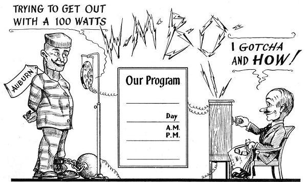 Hot Station: I started working at WMBO in Auburn in 1930. It was a small 100-watt station but not a bad place to work. The official slogan of the station at that time was "The Voice of the Finger Lakes." I'm not sure whether the call letters had any particular significance, but to me they stood for We May Burn Out. The station was first located on the third floor of the Hislop Building. That burned in 1932. The station relocated to the 9th floor of the Masonic Building and that burned 8 months later. In both cases we were able to get out without any injuries. The second time we lost the transmitter and everything so the station was off the air for awhile until the station relocated to the Metcalf Building. This was a month before I was to get married - we went ahead and got married anyway but lived pretty frugally for awhile.