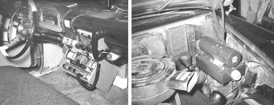 Dual Photo is the 1965 mobile station of W3ZWI in Ross Township, PA. Top photo shows 1954-vintage Multi-Elmac AF-67 transmitter under the dash with Multi-Elmac PMR-6A receiver installed in dash of a 1957 Plymouth. PSR-12 vibrator power supply for the receiver can be seen mounted behind the transmitter. Western Electric handset. Lower photo shows installation of WW II surplus Wincharger PE-101-C dynamotor in engine compartment of '57 Plymouth. Total mobile installation weighed some 50 pounds.