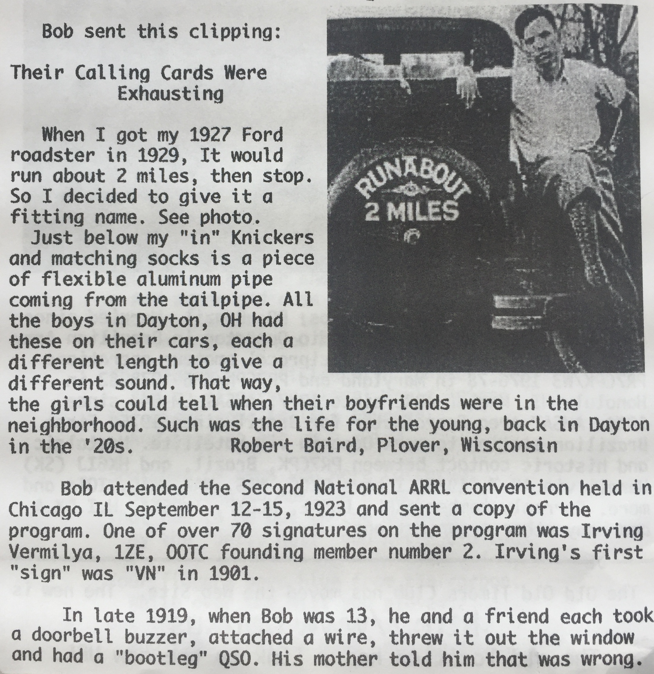 First Call: 8BTI Other Call(s) 8CWR, W8CRW & W9JJ Bob Baird, W9NN, of Plover, Wisconsin, died August 1. He was 96. Baird was one of the longest-licensed amateurs in the US, having been a ham for more than eight decades. "Bob was an icon, and he will be missed by many in Wisconsin and around the world," said ARRL Wisconsin Section Manager Don Michalski, W9IXG. Baird remained active on the air until shortly before his death and was often heard on 40-meter CW. He reportedly died peacefully in his sleep with his niece, Betty Johnson, WD9AUC, at his side.