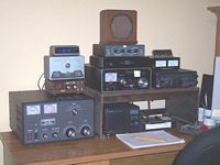 ![]() Photo courtesy NØUF - July, 2004 My station consists of a Yaesu FT-847 transceiver and an Ameritron AL-80B Amplifier. The accesories include an Astron SS-25M power supply, an AEA MM-3 Keyer, a 1961 Vibro-Keyer with a Hallicrafter Gray Base, an SP-8 external speaker, an FC-20 auto tuner, an Ameco PT-3 Preamp and an MFJ-968 Tuner. The Heath "Q" multiplier and old Philco Speaker are just on display, You can also see a Heathkit Coffee mug just past the keyer. This station will be rebuilt later this year. Seperate FM rigs for 144MHz and 220MHz will be added de NØUF op Bob .. |