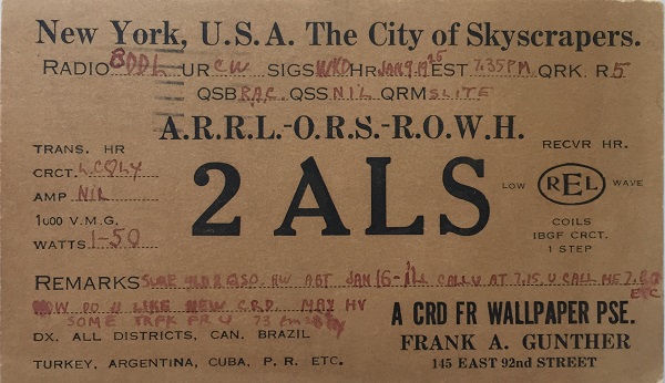 Professionally, Frank joined Radio Engineering Laboratories (REL) in 1925. He became president of REL in 1960. In 1977 he received the DeForest Pioneers-Lee DeForest Award for being Original Developer of Short Wave Radio Equipment, and in 1992 was featured in a PBS television program entitled Empire of the Air, The Men Who Made Radio. The Radio Club of America established the Frank A. Gunther Award in 1996 for major contributions to the advancement of military electronic communications systems, with Mr. Gunther as the first recipient. Most recently, Mr. Gunther worked as a consultant with his son, Robert, president of Highpoint Development Ltd. of Staten Island. He is survived by his sons, Frank M. and Radio Club member Robert C. Gunther; five grandchildren, six great-grandchildren and five step-grandchildren |