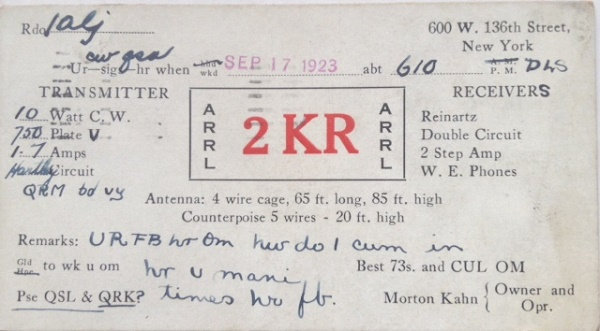 W2KR - April 19, 1982 Morton B. 'Mort' Kahn Patchogue LI, NY Great Neck LI, NY Liverpool, NY Pompey, NY Boca Raton, FL Charter Member #16 Born: January 16, 1908 First call: 2AAG Other call(s): 2KR, 2XCA & K4KR ![]() From the 1953 QCWA Yearbook ![]() 1947 Meeting ![]() Station (circa 1953) ![]() ![]() Images courtesy of the NL7XM Collection |